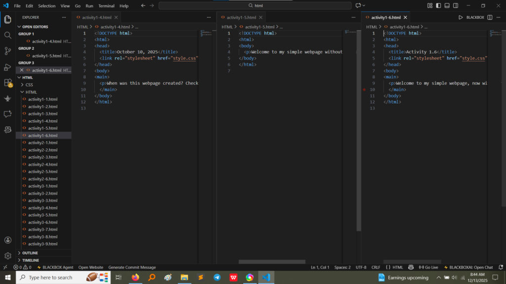 • HTML Code (Activity 1.1, 1.2, 1.3): The image below shows the HTML code for activities 1.1, 1.2, and 1.3. Notice the consistent use of the <!DOCTYPE html> declaration, and the nested <html>, <head>, and <body> tags. The <title> tag within the <head> defines the text that appears in the browser tab. The content visible to the user, such as headings (<h1>) and paragraphs (<p>), is placed within the <body>. (Image Here: html code.png – showing activity1-1.html, activity1-2.html, activity1-3.html code)