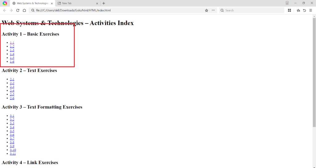 • Output (Activity 1.5 and 1.6): The output comparison below highlights the importance of the structure. While the text content is the same, having the correct structure (Activity 1.6) is necessary for proper function, metadata, and the application of external styles. (Image Here: output5.png – showing output for activity1-5.html) (Image Here: output6.png – showing output for activity1-6.html)
