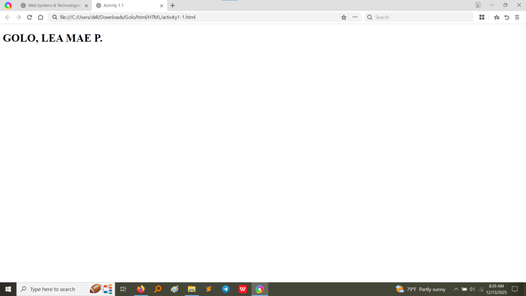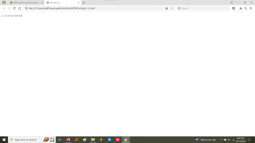 • Output (Activity 1.1, 1.2, 1.3): These screenshots show the rendered output of the basic HTML files, confirming that the content within the <body> (the name, the numbers, and the heading/paragraph) is displayed correctly on the webpage. The text specified in the <title> tag is visible on the browser tab (though partially obscured in some screenshots, the tab context is clear). (Image Here: output2.png – showing output for activity1-1.html) (Image Here: output3.png – showing output for activity1-2.html) (Image Here: output4.png – showing output for activity1-3.html)