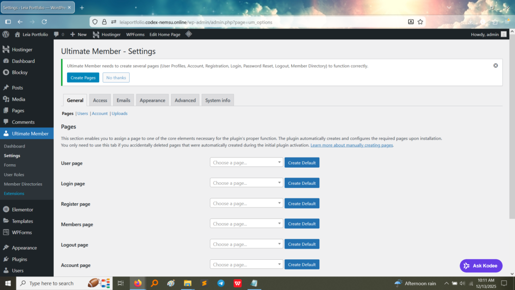 3. Automatic Page Generation: A crucial part of installing a membership plugin is generating the necessary frontend pages. The “Settings” page shows a banner prompt to “Create Pages” (or an implied status that these pages—User Profile, Login, Register, Logout, etc.—have been assigned). The plugin handles the complex task of creating the public-facing endpoints for user interactions. (Image Here: Ultimate Member – Settings.jpg – showing the Ultimate Member Settings page, particularly the “Pages” section for assigning core functionality pages)