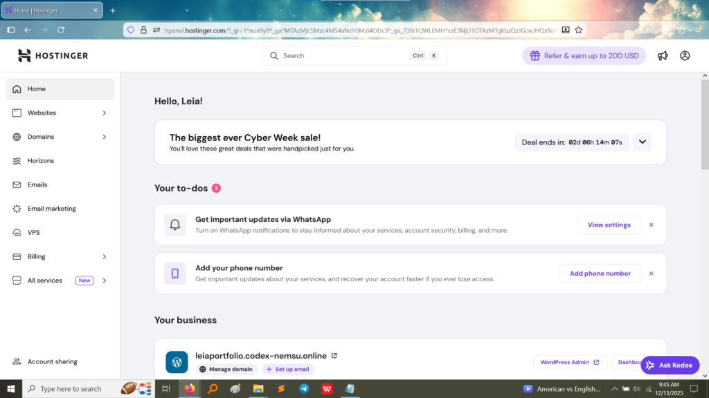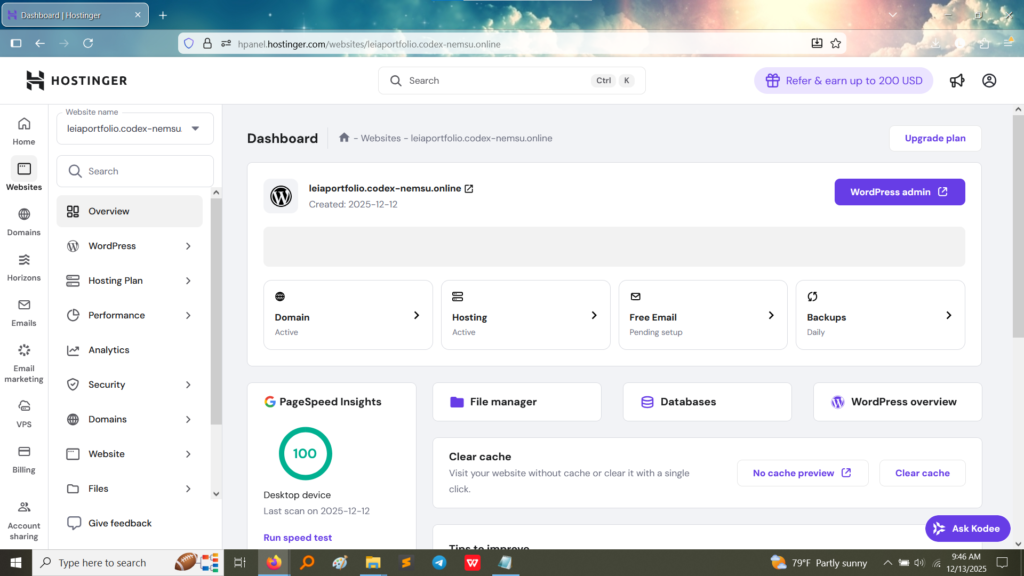 | 1. Hostinger Setup | Purchased or activated a hosting plan and registered/linked the domain name (leiaportfolio.codex-nemsu.online). | Established the environment for deployment. |