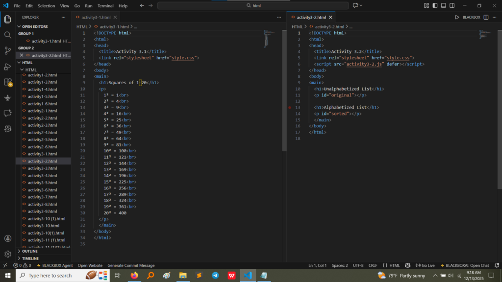 • HTML Code (Activity 3.1 & 3.2):Activity 3.1 uses the <sup> tag to correctly display exponents, showing the squares of numbers 1 through 20 (e.g., $1^2$, $2^2$). Activity 3.2 uses the <sub> tag to show subscript text, which is useful in chemical formulas like $\text{H}_2\text{O}$ or for general content demonstration.(Image Here: html code3.1_3.2.png – showing activity3-1.html and activity3-2.html code)