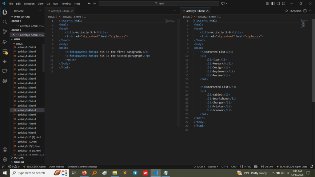 • HTML Code (Activity 3.4):The code utilizes the <ol> (Ordered List) tag for a sequence of steps that require a specific numerical order, and the <ul> (Unordered List) tag for a simple collection of items using bullet points. Both use <li> for List Items.(Image Here: html code3.4.png – showing activity3-4.html code)