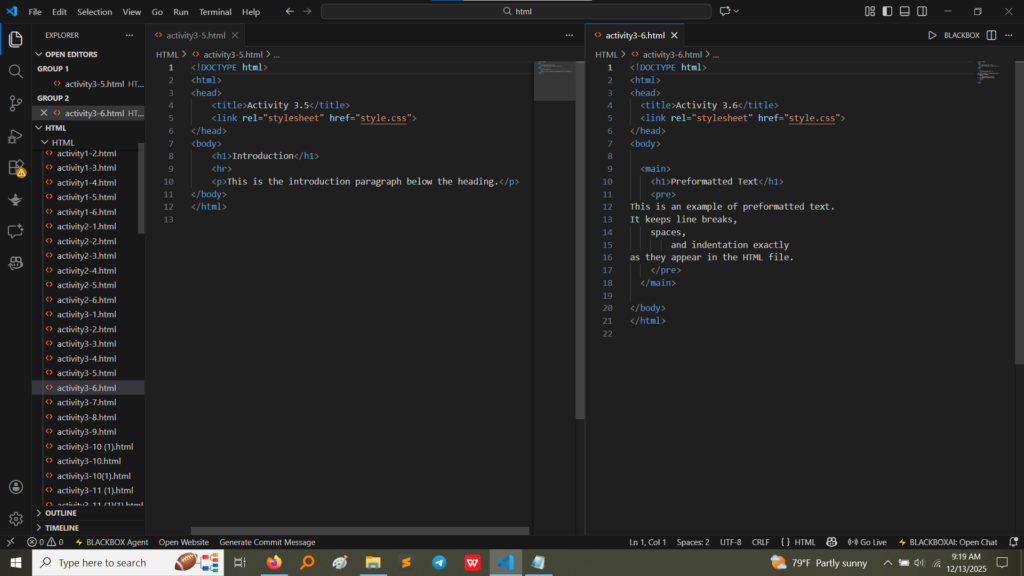 • Controlling Spacing: The contrast between standard paragraphs (Activity 3.3) and preformatted text (<pre> in Activity 3.6) highlighted the browser’s default whitespace handling and how to override it when necessary for displaying code or ASCII art.