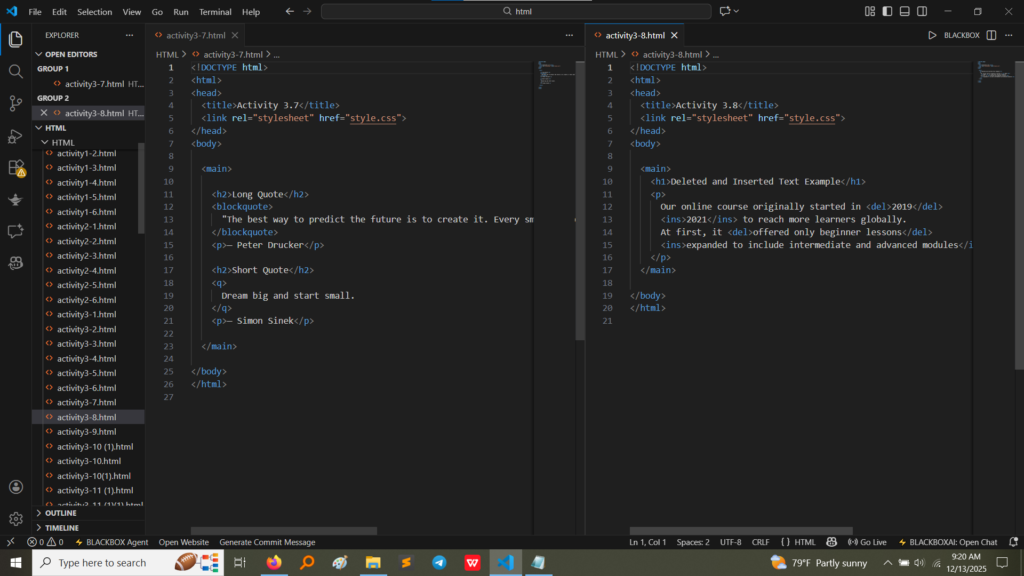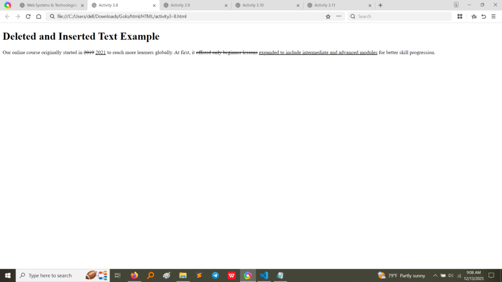 3.8<del> and <ins>Deleted and Inserted text.Screenshot of code and output: 2019 is struck through (<del>), and 2021 is underlined (<ins>), representing a revision history. (Image Here: html code4.png – showing activity3-8.html code)