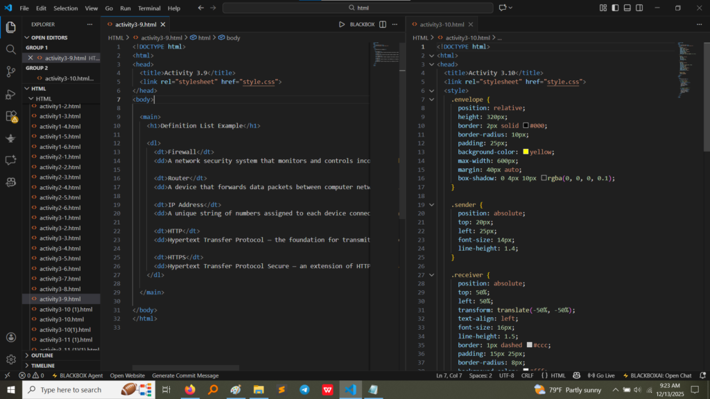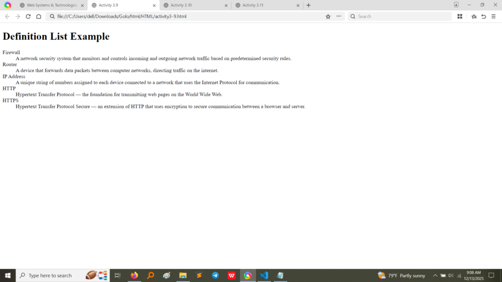 • Definition List (Activity 3.9):The code uses the <dl> (Definition List), <dt> (Definition Term), and <dd> (Definition Description) tags to create a structured list of network security terms and their explanations.(Image Here: html code5.png – showing activity3-9.html code)