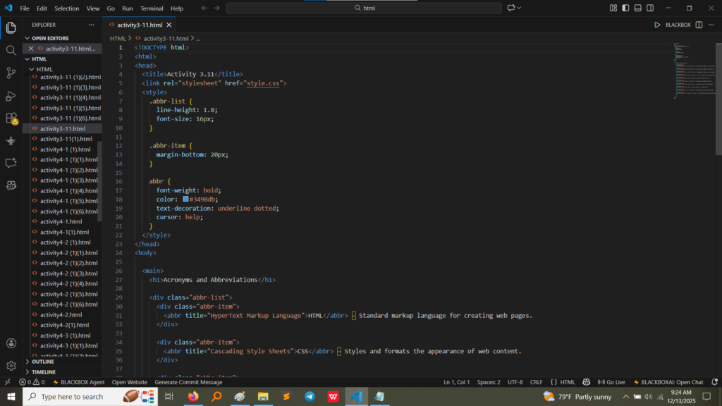 • Acronyms (Activity 3.11):The code uses the <abbr> (Abbreviation) tag with the title attribute. When the user hovers over the abbreviation (e.g., HTML), the full title (“Hypertext Markup Language”) appears as a tooltip, as styled in the internal <style> block.(Image Here: html code6.png – showing activity3-11.html code)