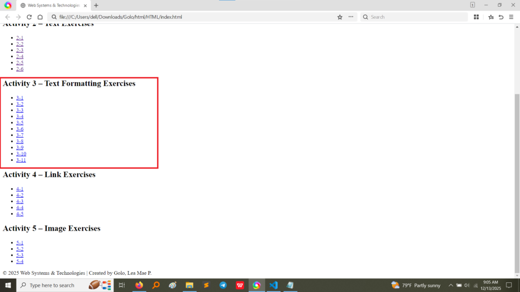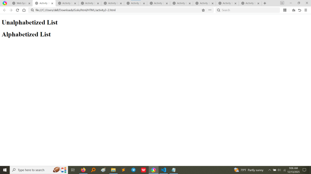 • Output (Activity 3.4):The browser output renders the ordered list with numbers (1., 2., 3., etc.) and the unordered list with standard bullet points, confirming correct list implementation.(Image Here: output5.png – showing output for activity3-4.html)