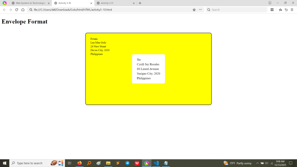 • Output (Activity 3.3):The output shows that the first paragraph has two lines (due to <br>), and the second paragraph starts on a new line with automatic spacing, demonstrating the difference between a paragraph break and a line break.(Image Here: output4.png – showing output for activity3-3.html)