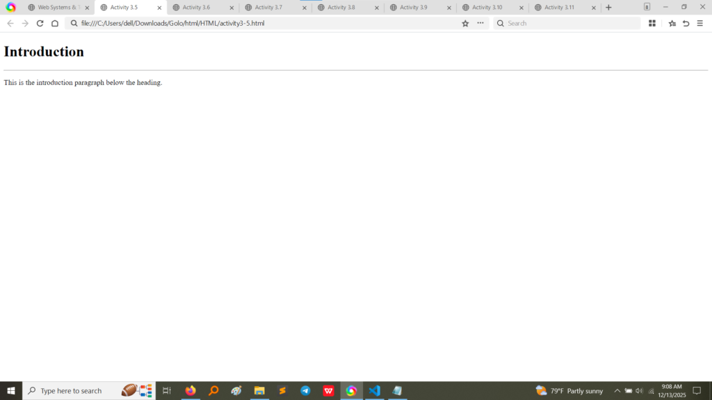 3.5<h> and <p>Standard heading and paragraph.Screenshot of rendered output: a heading “Introduction” followed by a standard paragraph. (Image Here: output6.png – showing output for activity3-5.html)