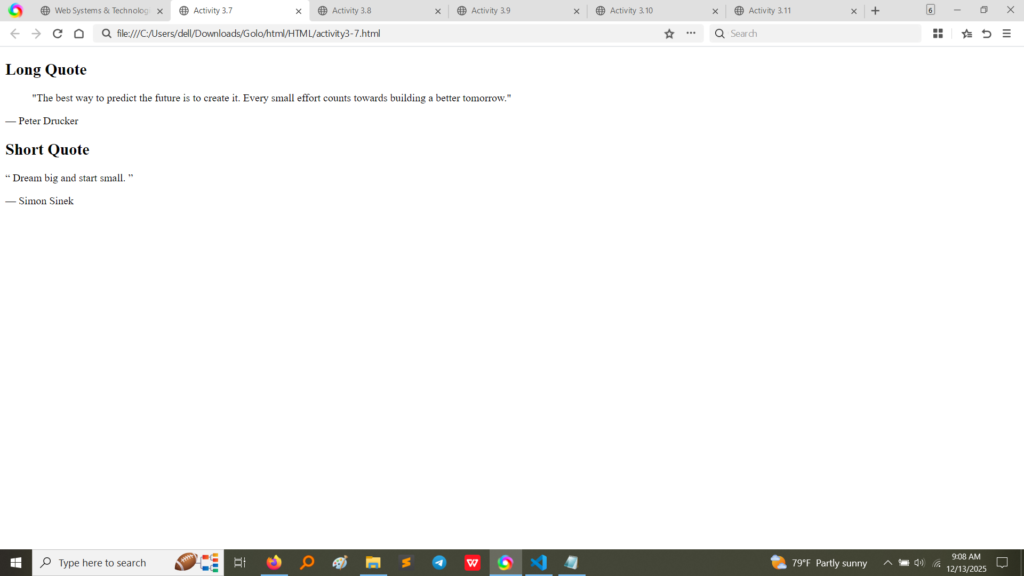 3.7<blockquote>Long quotation.Screenshot of code and output: The quotation by Peter Drucker is indented by the browser, differentiating it from surrounding text. (Image Here: html code4.png – showing activity3-7.html code)