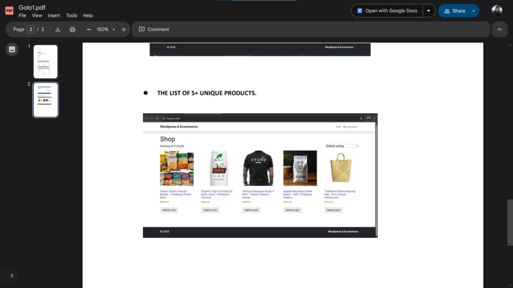 • 1. Configured Shop Page: The image below displays the main Shop page, which lists multiple products with their images, names, prices (in PHP currency, ₱), and an “Add to cart” button. This page successfully demonstrates the visual presentation and organization of the store’s inventory. The page is titled “Shop” and is showing five unique products, as required.